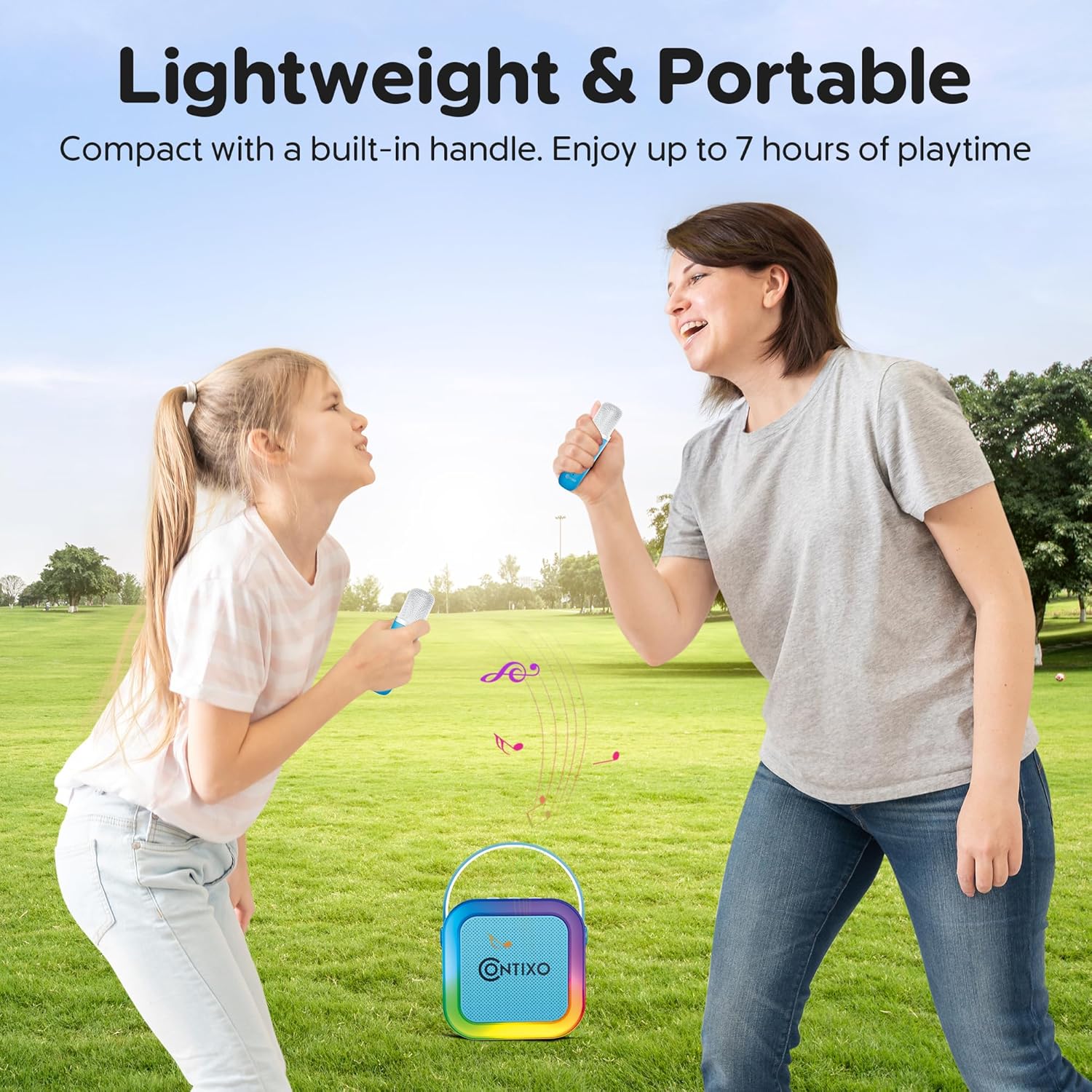 Contixo KS1A Kids Mini Karaoke Machine with LED Lights, 7–10H Playback, Dual Wireless Mics, Magic Voice Effects, Bluetooth Speaker for Children, Portable Singing Toy Gift for Boys & Girls, Blue