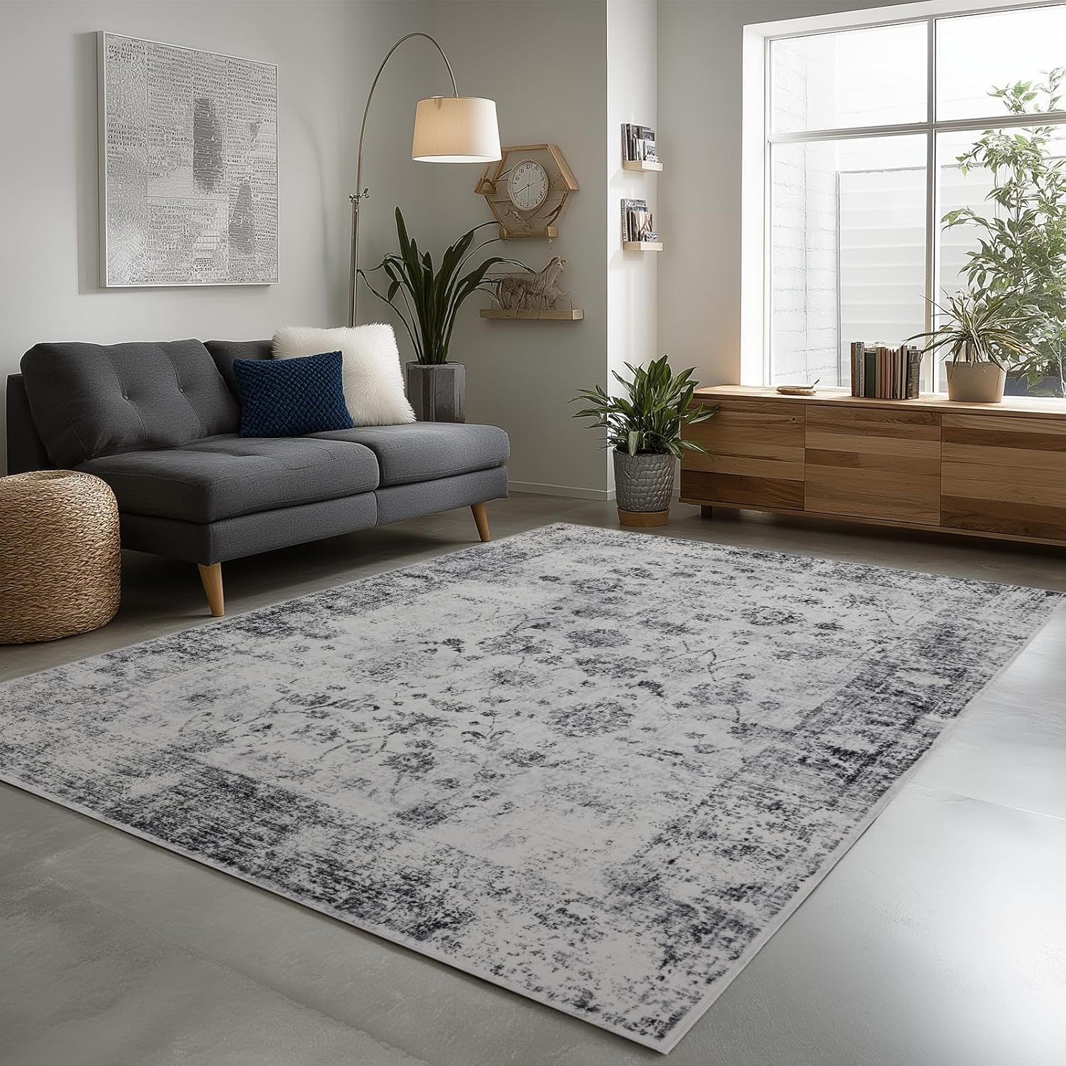 Washable 6x9 Area Rug for Living Room, Carpet for Bedroom Dining Room, Non Slip&Non-Shedding Resistant Low Pile Vintage Print Rug for Home Office ((White/Grey)