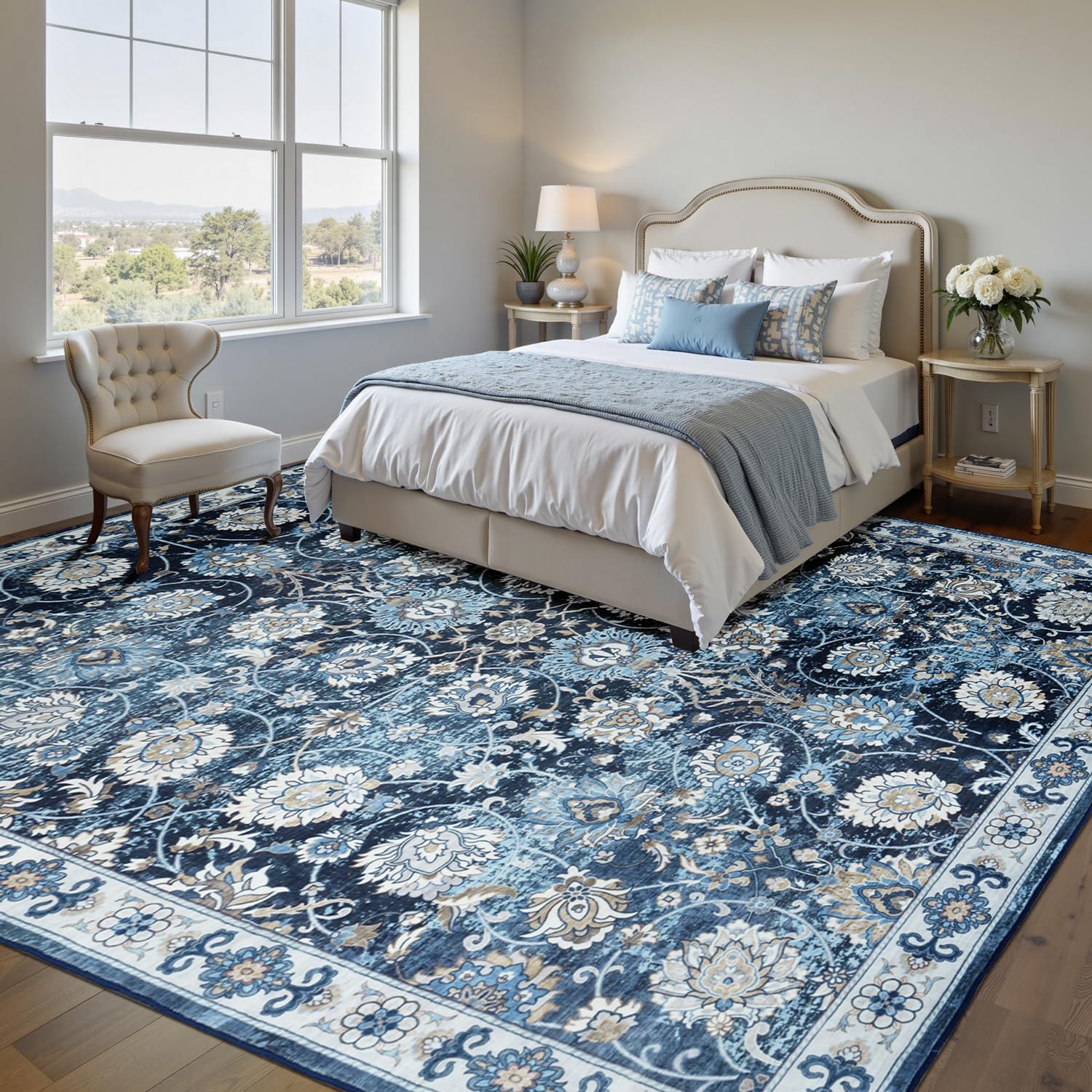 Blue 9x12 Area Rugs for Living Room, Washable Large Rug, Vintage Floral Soft Carpet, Non Slip & Low Pile, Wool Carpets for Indoor Bedroom Dining Home Playroom Office Under Table, Blue Garden
