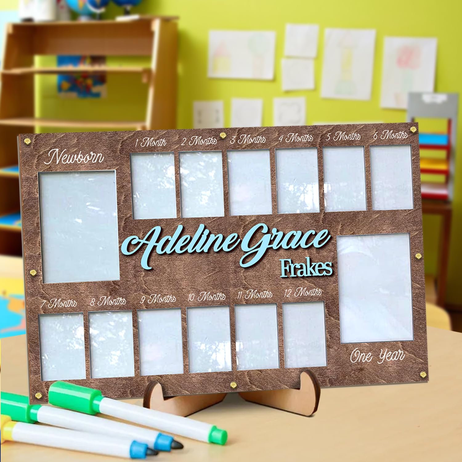 - My First Year Photo Frame: Capture your baby’s first year with our babys first year picture frame. This baby first year photo frame helps you record their growth from newborn to one year, showcasing each milestone in a 12 month picture frame for baby first year. The wooden plaque includes space for your baby’s full name, making it a personalized keepsake. Our 12 month pictures for baby first year, my first year photo board, one year photo board is a wonderful way to celebrate these moments.