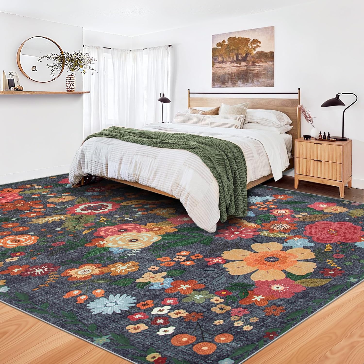 8x10 Area Rug for Living Room: Vintage Floral Washable Rug Soft Boho Non Slip Carpet Large Indoor Floor Non Shedding Low Pile Thin Carpets for Bedroom Dining Room Farmhouse Nursery Home Office Black