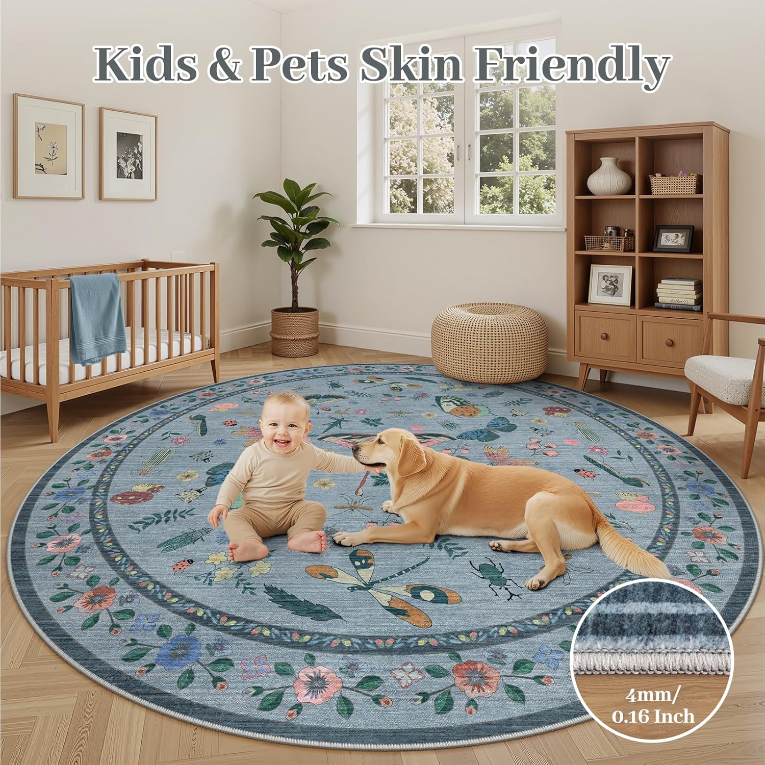 - Kid & Pet-Friendly Low Pile Design: Nursery Rug Round with a 0.16" ultra-thin pile, this modern insect rug prevents trapped crumbs, pet hair, or dirt. Durable enough for playrooms yet stylish for living spaces, it simplifies cleanup from unexpected messes