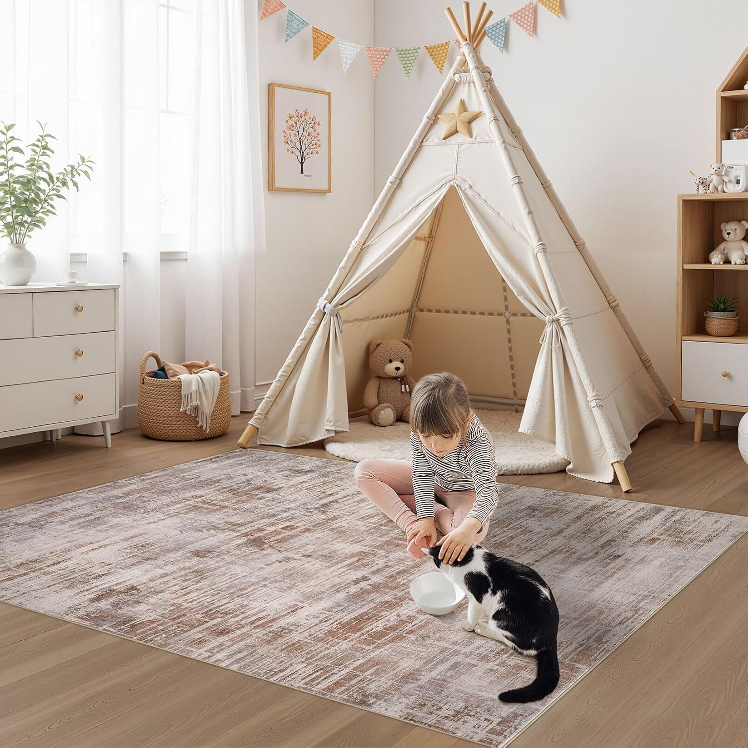Area Rug for Living Room: 4x6 Washable Neutral Abstract Modern Soft Rugs Non Slip Indoor Floor Stain Resistant Carpet for Bedroom Dining Room Office Nursery - Red Brown