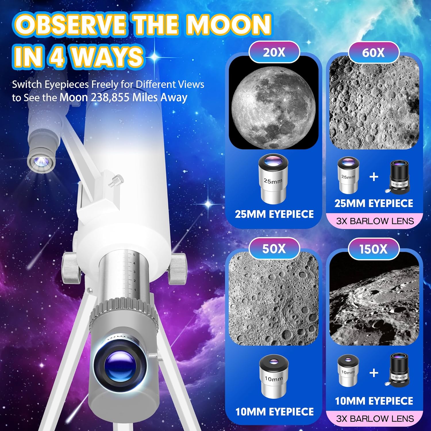 - Flexible Magnification: Easily switch from wide-field views (20X) to high-powered zooms (up to 150X) using the two included eyepieces and powerful Barlow lens. Perfect for beginners to spot birds and wildlife on earth or the moon