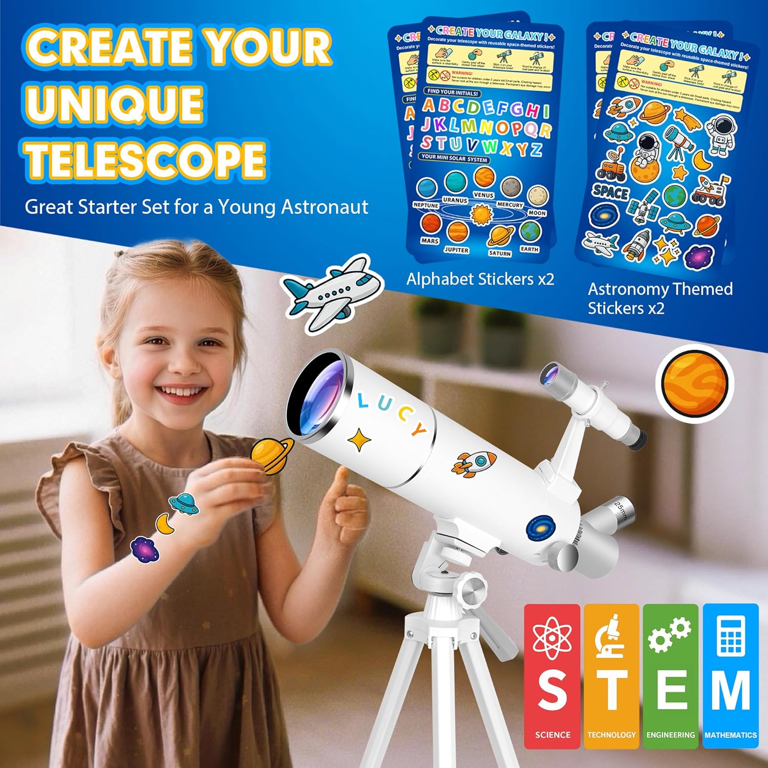 - Exclusive Space-Themed Stickers: Includes a set of stickers—fun space, rockets, and alphabet decals to decorate your own telescope and personalize your discovery journey. Also comes with a smartphone adapter for capturing the observation moments