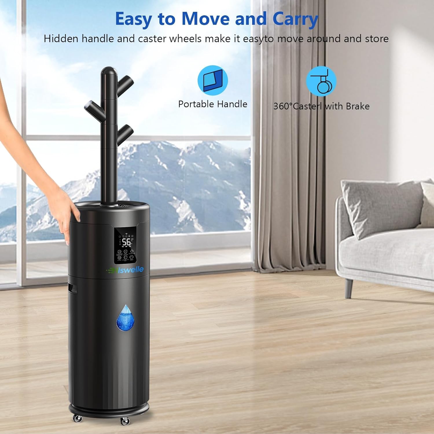 - 【All the Convenient Designs in One 】1. The humidifier comes with 4 flexible wheels that can help us to move it easily, it's convenient for pregnant women, the elderly, etc. 2. The sprayer tube can help it deliver the mist to higher places, reducing wetting the floor. 3. There are 4 mist volume modes(low to highest), constant mode v.s. intermittent mist mode adjustable to satisfy different situations. 4.There is an aroma box on its back to help us enjoy fragrance.