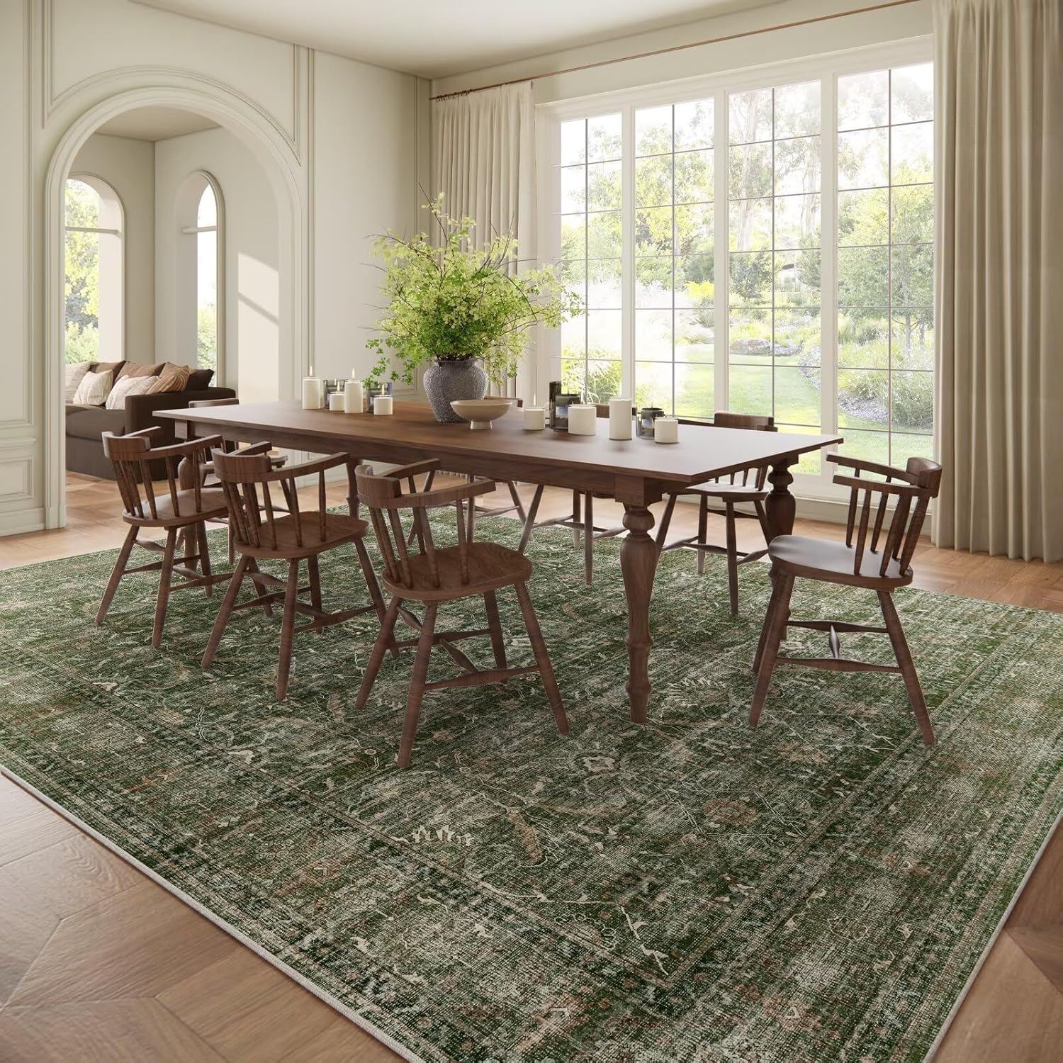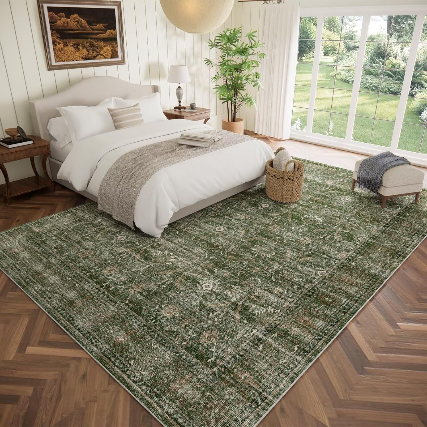 Washable 9x12 Area Rugs for Living Room, Boho Non-Slip Silicone Backing Rugs for Bedroom Dining Room Nursery Office, 0.3" Neutral Oriental Throw Carpet with 0.16" Cushioning Pad, Grass Green/Multi