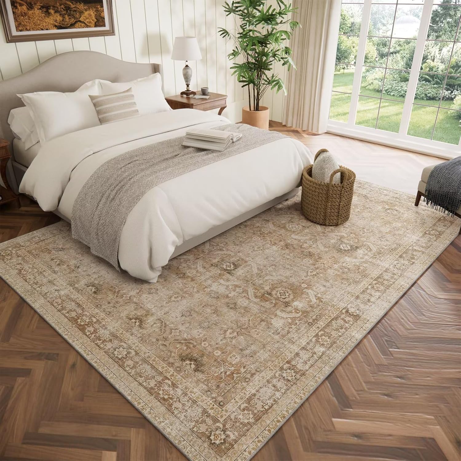 Washable 6x9 Area Rugs for Living Room, Boho Non-Slip Silicone Backing Large Rugs for Bedroom Dining Room Nursery Office, 0.3" Neutral Oriental Throw Carpet with 0.16" Cushioning Pad, Brown/Multi