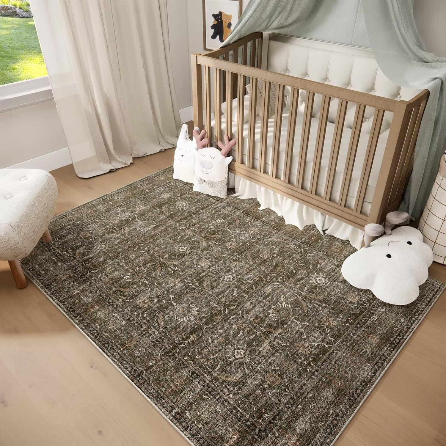 Washable 5x7 Area Rugs for Living Room, Boho Non-Slip Silicone Backing Rugs for Bedroom Dining Room Nursery Office, 0.3" Neutral Oriental Throw Carpet with 0.16" Cushioning Pad, Deep Brown/Multi