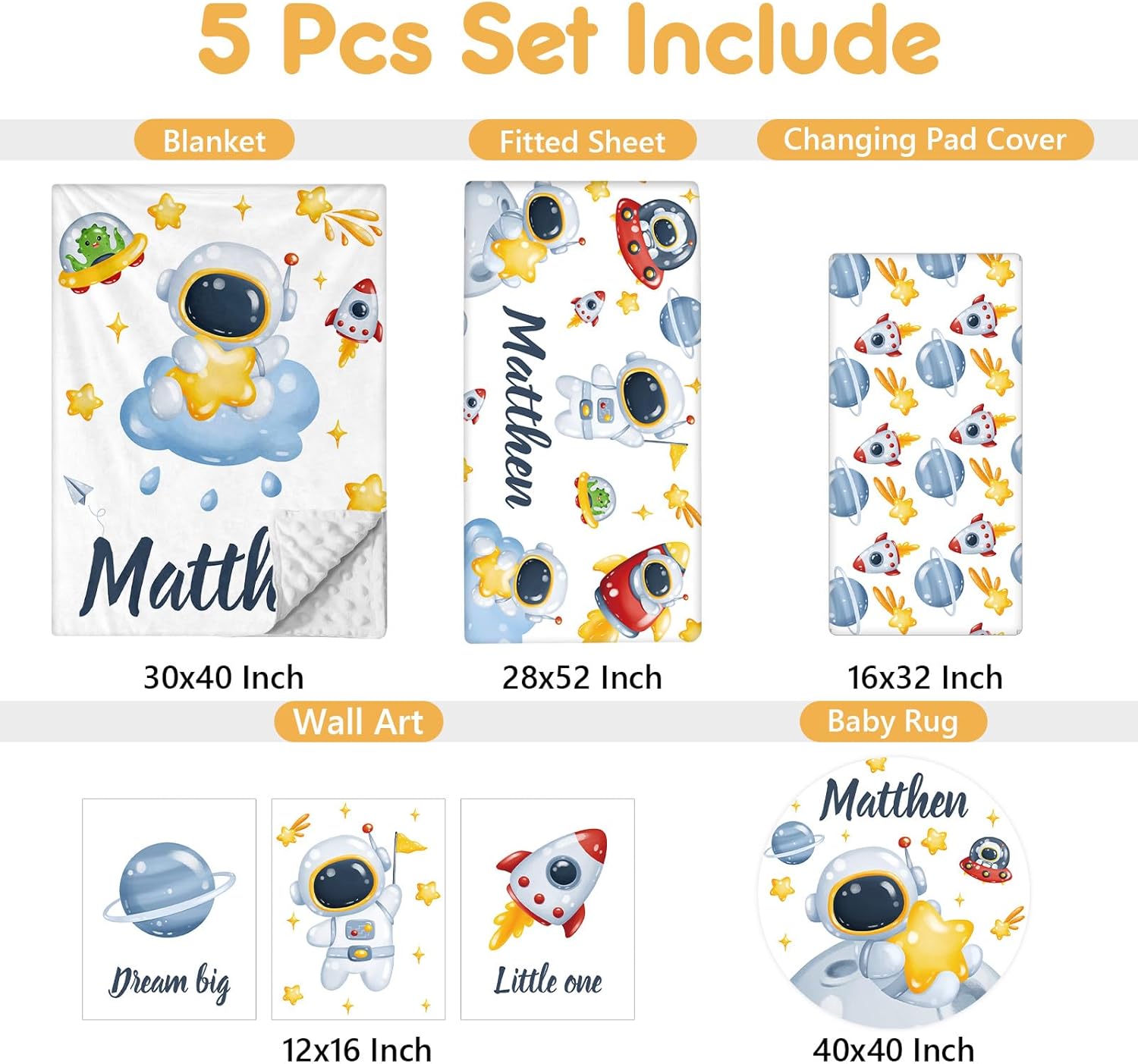 - Complete Set: This customized baby bedding set includes a double layer dotted backing blanket, crib sheet, changing pad cover, baby rug and wall arts, designed to add style and comfort to your nursery. The dotted backing of the double-layer blanket will be adored by your little one.