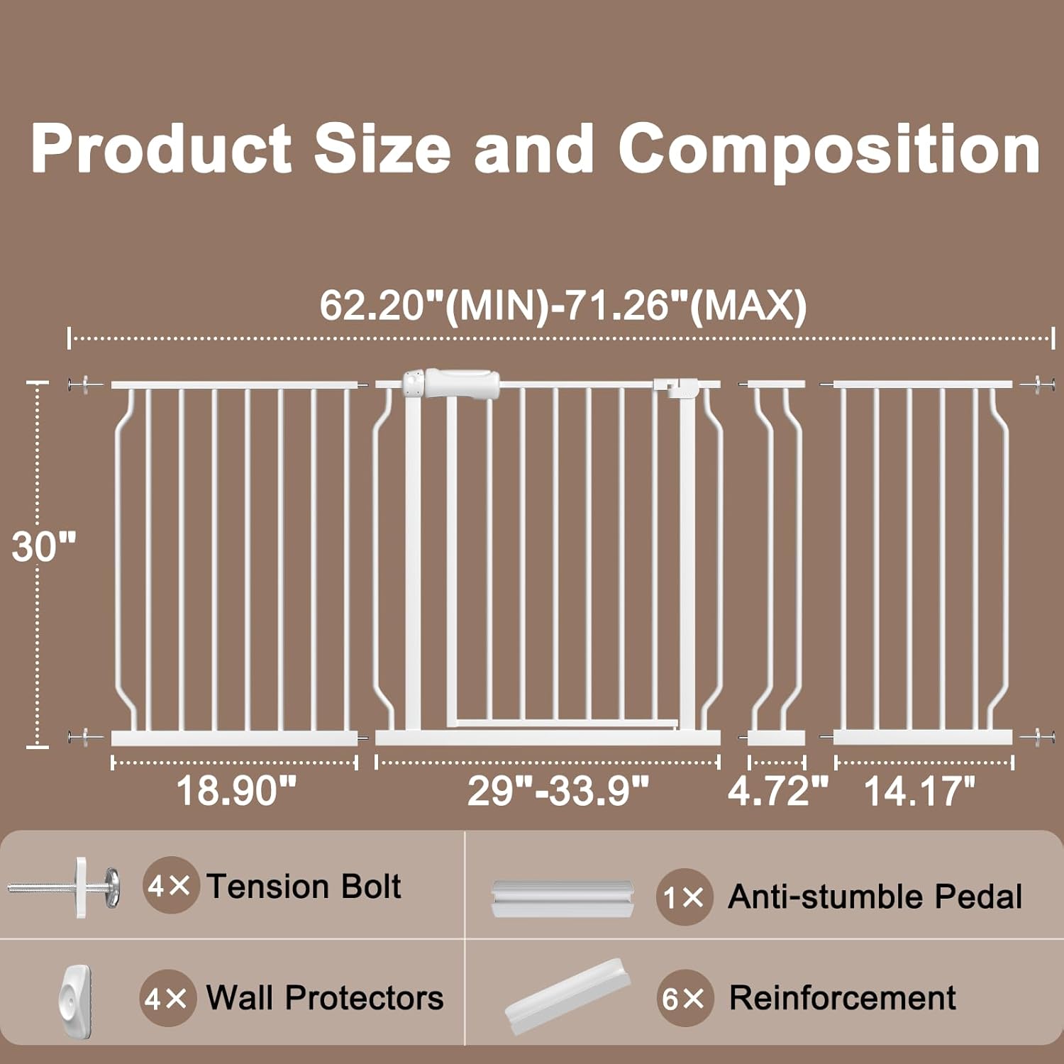 WAOWAO Baby Gate 62.20-71.26" Extra Wide Pressure Mounted Walk Through Swing Auto Close Safety White Metal Toddler Kids Child Dog Pet Puppy for Stairs,Doorways,Kitchen