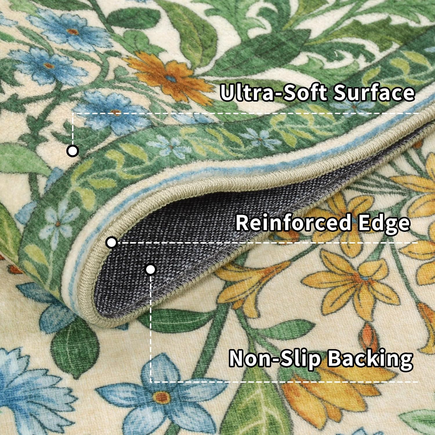 5×7 Grass Green Washable Floral Area Rug,Vintage Boho Soft Low-Pile Living Room Rugs, Stain Resistant Botanical Non-Slip Carpet for Bedroom,Dining Room, Kids Nursery,Home Decor