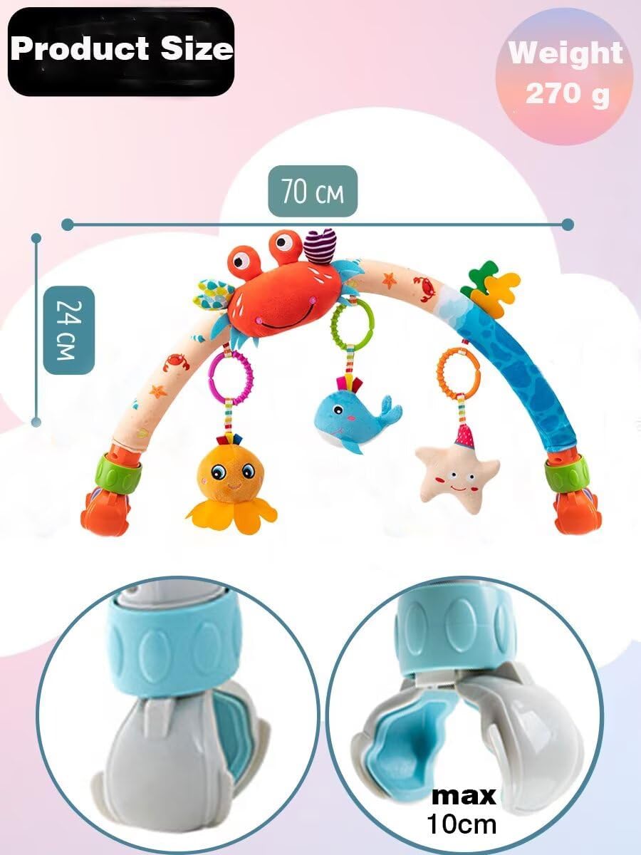 - Carseat toys for infants 3-6 months,Stroller toys have variety of graphics,cloud with a bell.BB squeaker in the crab,press to make a Bi~ Bi~ sound.Fish has colorful rotating ball.
