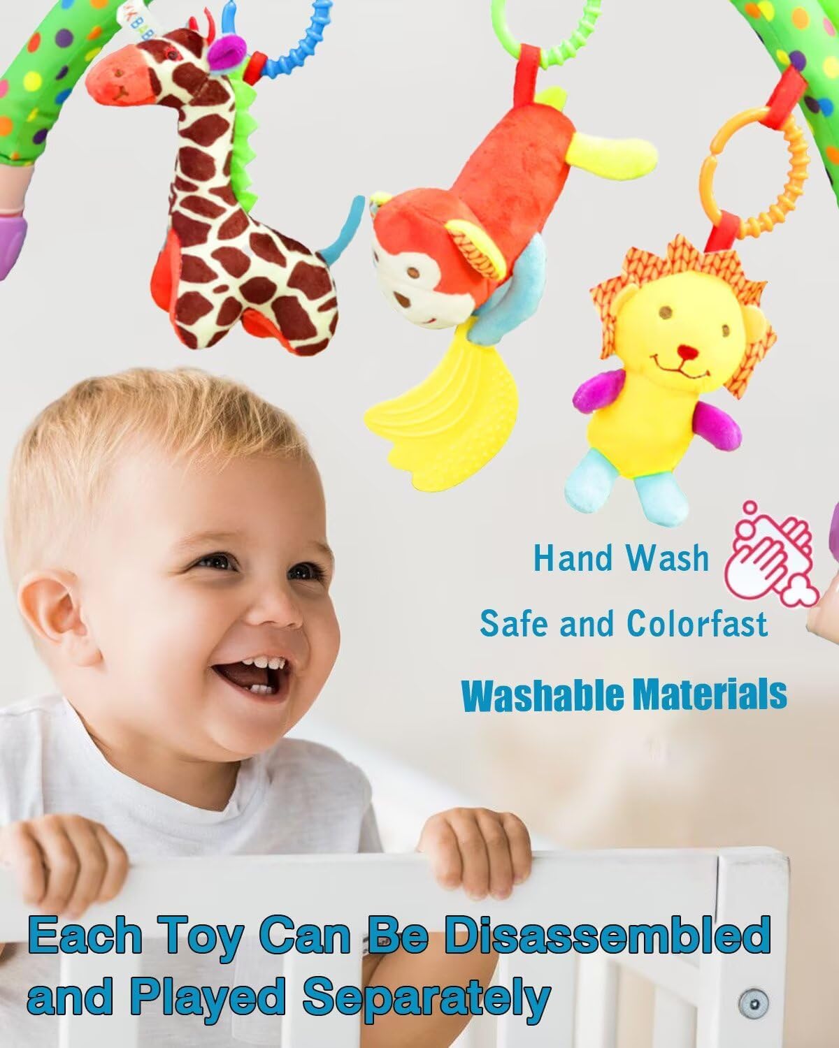 - Car seat toys,It is an early development toy.crib toys hanging made of washable materials.Each stroller toy can be detachable dsassembled and played separately.