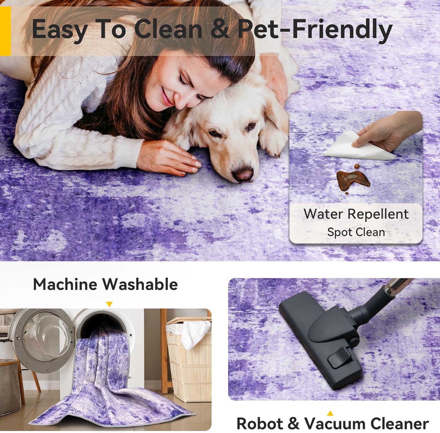 - Tides Series – Effortless style that flows with your life.This modern machine-washable non-slip rug features reinforced edges and a low-pile design that resists dirt. Its water-repellent surface makes spills easy to clean - liquids bead up for quick wiping. Simply machine wash in cold water (no bleach) to refresh. The non-slip backing keeps it securely in place. A perfect blend of function and contemporary design for active homes.