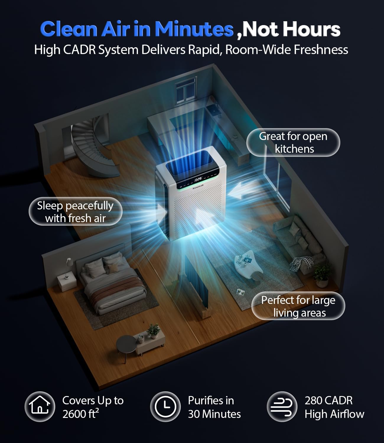 - 𝐖𝐇𝐎𝐋𝐄 𝐇𝐎𝐌𝐄 𝐂𝐎𝐕𝐄𝐑𝐀𝐆𝐄: Purifies up to 2,600 sq. ft. every hour and capturing 99.97% of airborne particles with a powerful 3-stage filtration system. Effectively captures common airborne pollutants like dust, smoke, pet dander. Breathe easier in every room with fresher, cleaner-feeling air.