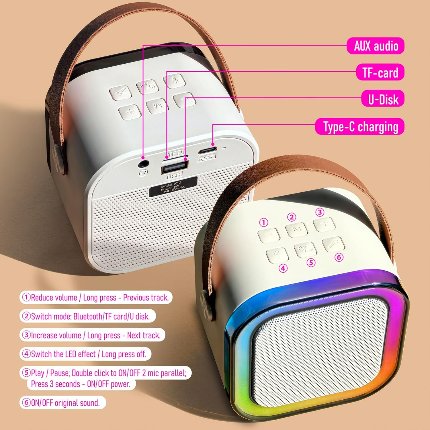 - 【Take the Party Anywhere】10H Playback(USB-C rechargeable) beats 90% of mini karaoke machines.Small and light design is convenient for you to take anywhere.And you can safely let your children play mini karaoke machine by themselves(meets toy safety standards).We promise provide replacement for any product damage within 5 years.